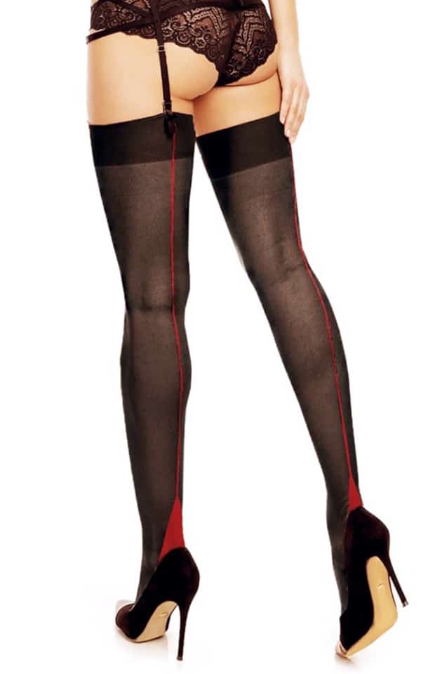 Delight er et par lækre strømper til hofteholder med klassisk søm og cuban-hæl. Strømperne er i sort med rød søm og flot rød cuban-hæl. Denne strømpe er en meget elegant og enkel strømpe, som vil gøre sig godt til enhver lejlighed. Let shine kvalitet med forstærket tå. Lækker kvalitet fra tyske Glamory som har specialiseret sig i plussize strømper samt strømper til lange ben.