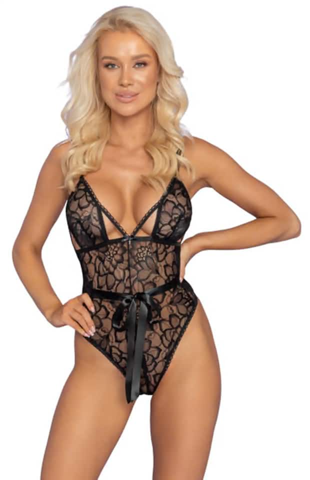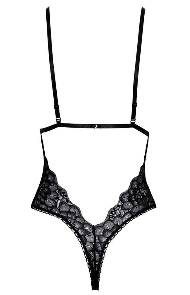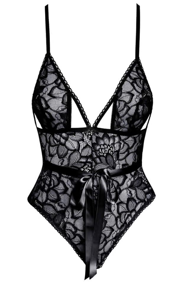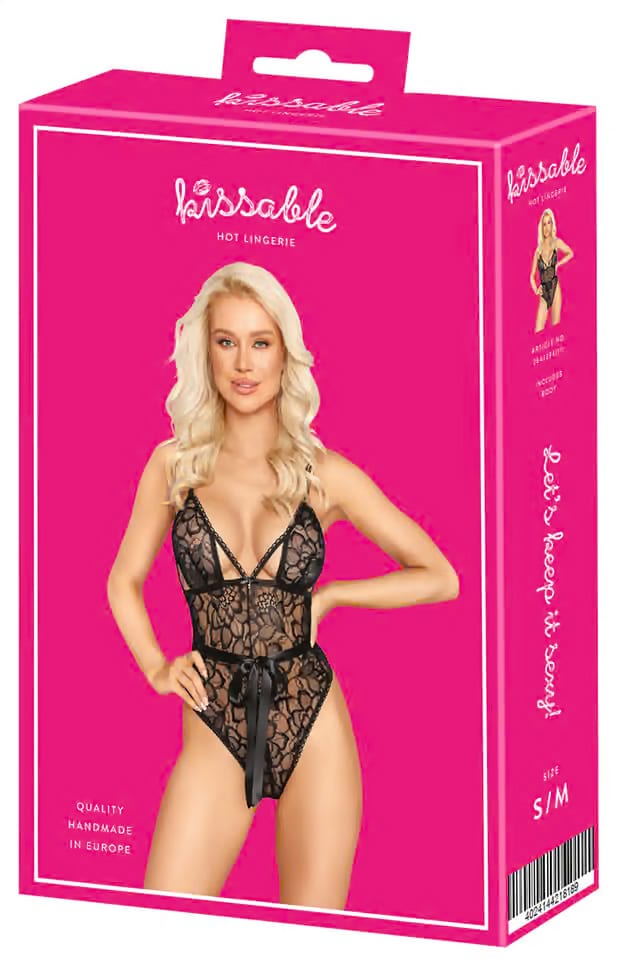 Sort bodystocking fra Kissible. Med flot udskæring, blondemønster og satinbånd som bindes om taljen. Under brystet er der et elastisk bånd som giver brystet et flot hold. På bagsiden er ryggen bar og ligner et BH og G-strengstrusse. Bodystockingen kommer i en fin æske og er dermed også ideel som gave. Str. S til XL.