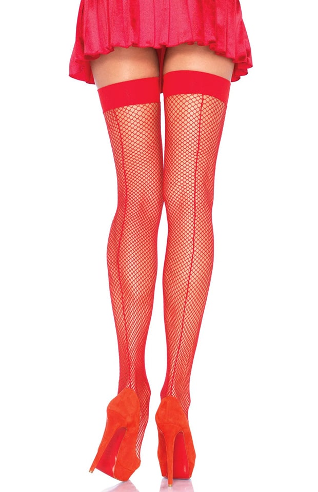 Sorte eller røde selvsiddende netstrømper fra Leg Avenue. I en blød kvalitet med finmasket net i sort med sort søm eller rød med rød søm. Sømmen er med lidt struktur. Med elastisk bred kant. Bemærk at disse strømper ikke har silikone. Forstærket usynlig tåparti. Onesize (S/M/L).