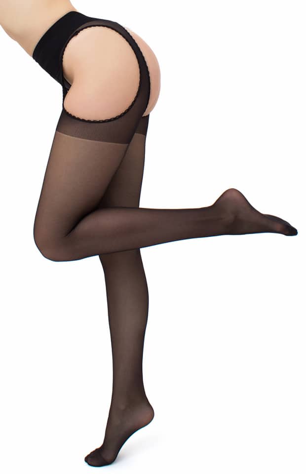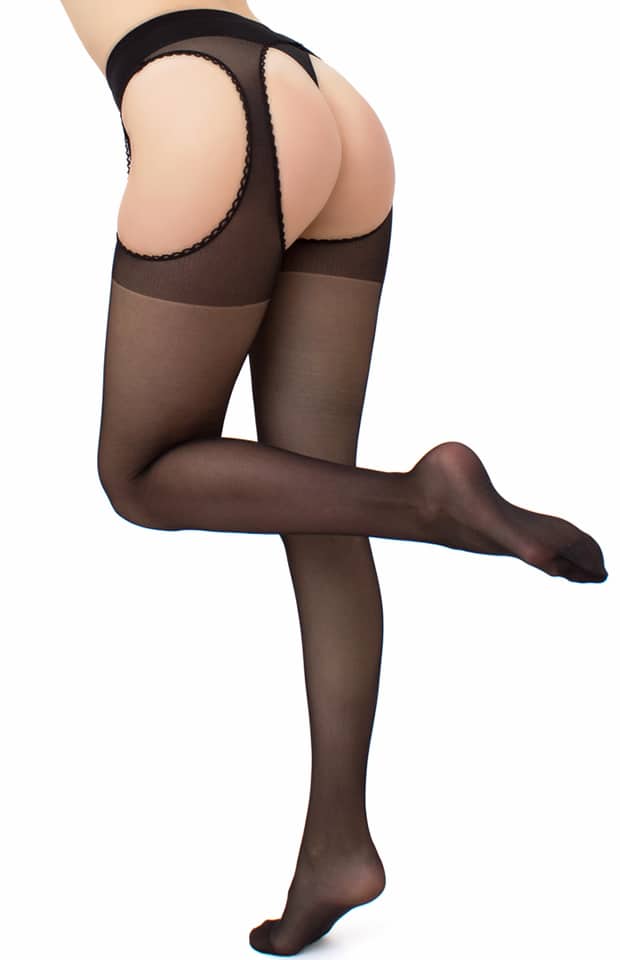 Strømpebukser med indbygget hofteholder fra Giulia. Strømpebukserne er sorte med åbent skridt og med indbygget hofteholder. Der er en lille mønstret kant rundt om åbninger ved den indbyggede hofteholder. Super forførende bundløse strømpebukser. Strømperne er i sort 20 denier med shine. Med bred elastisk kant i taljen for optimal komfort. Forstærket tå. Str. S til XL.