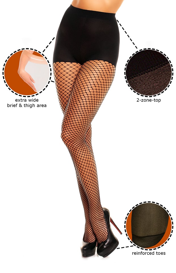 Elegante sorte netstrømper med indbygget shorts fra Glamory. Netstrømpebukserne har medium størrelse masker i en blød kvalitet. Med mat heldækkende overdel for perfekt hold og komfort. Med forstærket tå. Strømperne er i en super lækker kvalitet fra tyske Glamory, der har specialiseret sig i strømper til kvinder med kurver eller lange ben.